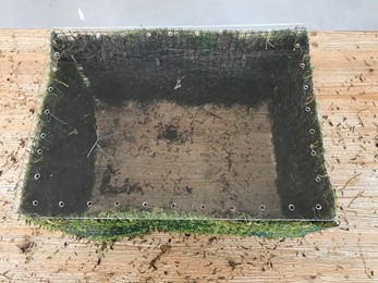De volgende materialen zijn nodig: Een doos vol mos, gaas en binddraad, een schaar, plexiglas, potgrond en diverse herfstplanten.
